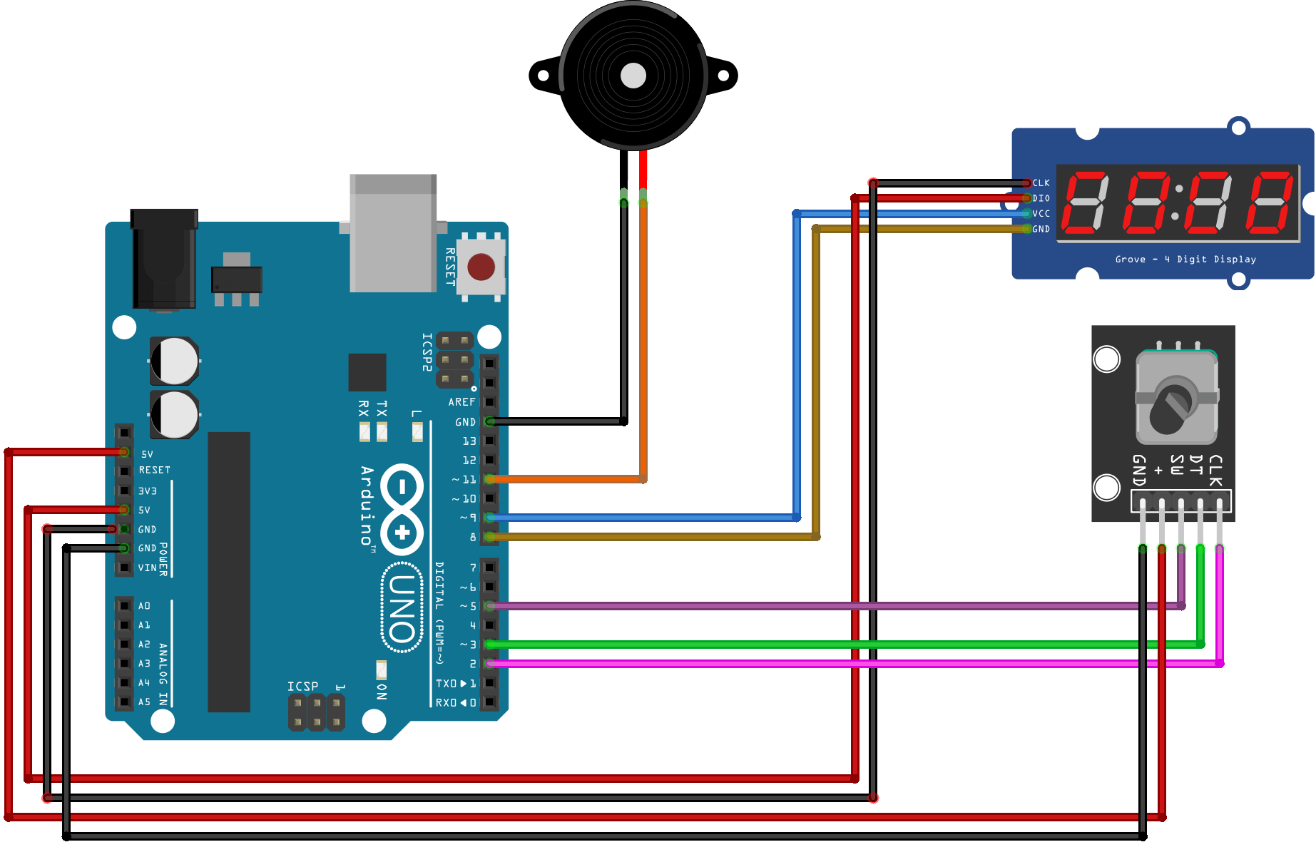 Encoder shaft is rotated clockwise or anti-clockwise to increase or decrease the number displayed in the 4-digit display module. Once the shaft is released the number will decrease at the rate of 1 number per second until it reaches 0. Once it reaches 0, the buzzer will beep three times.